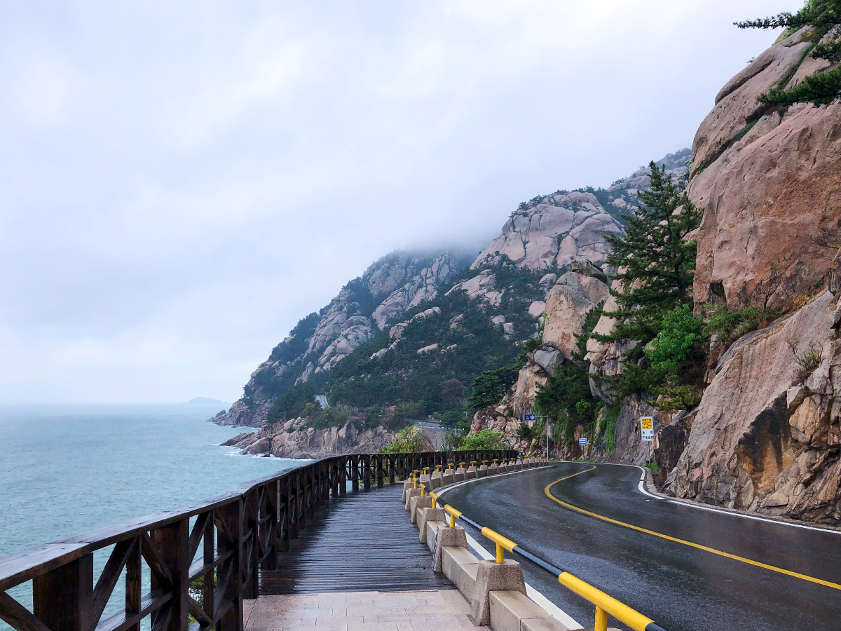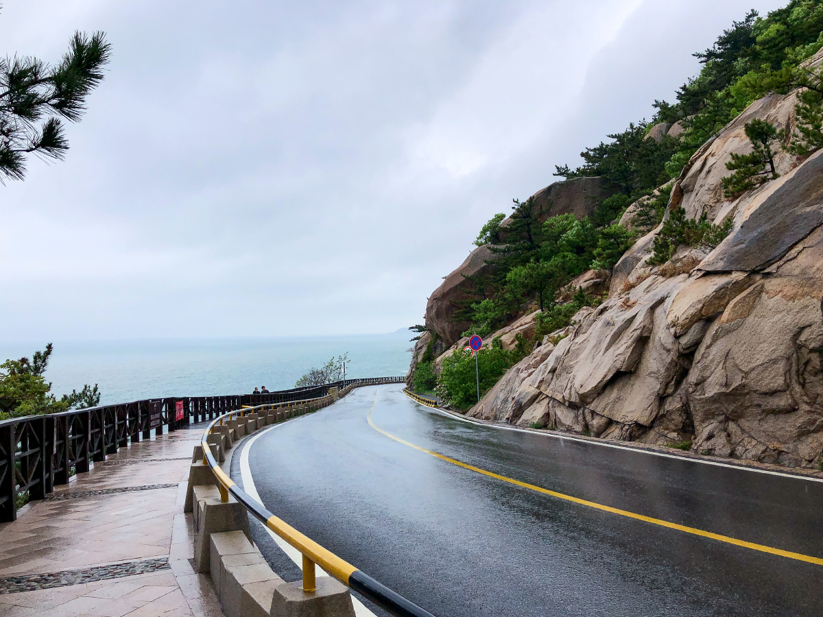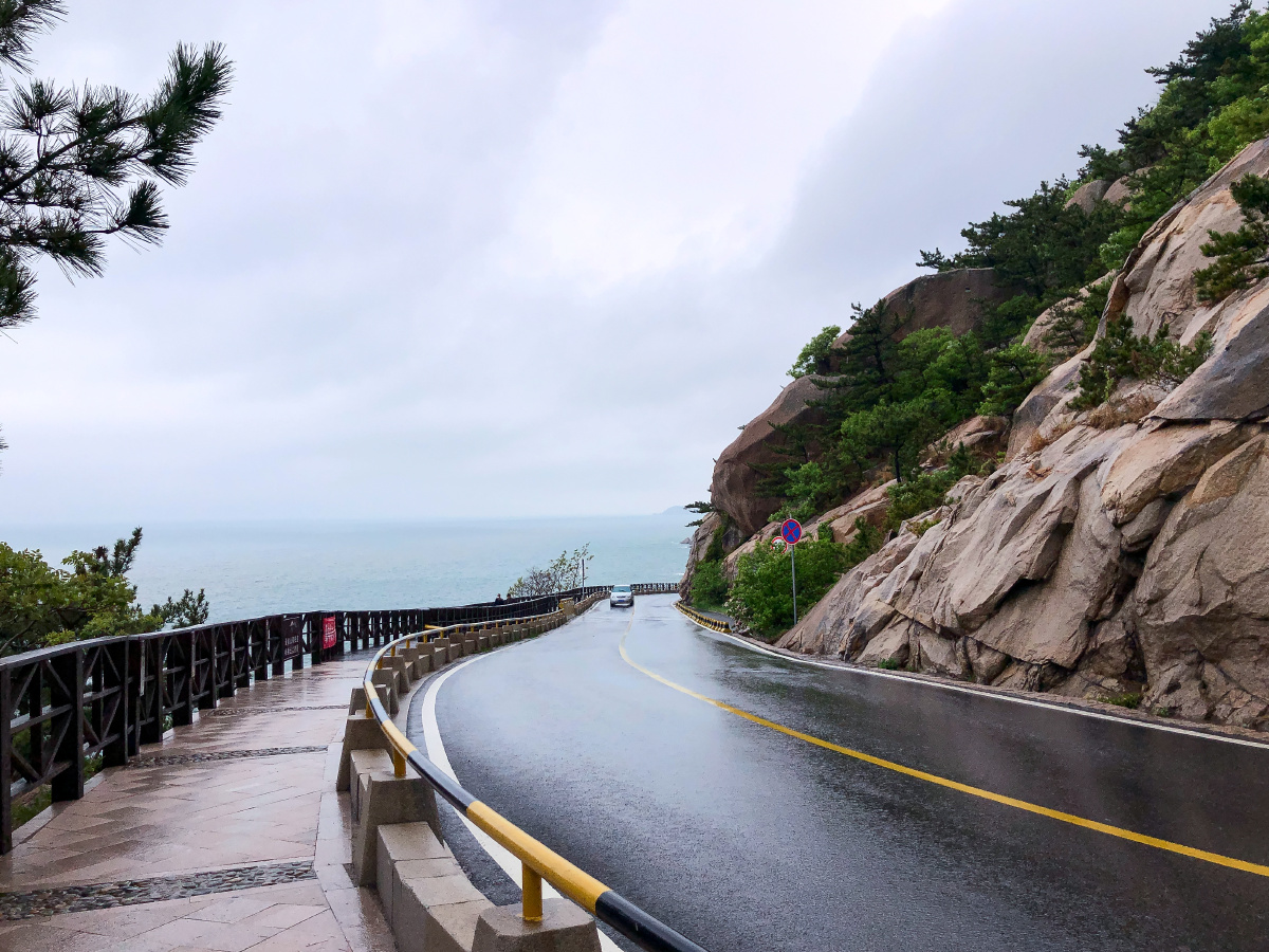 雨天,青岛崂山风景区前往太清宫方向的沿海公路。五一假期。