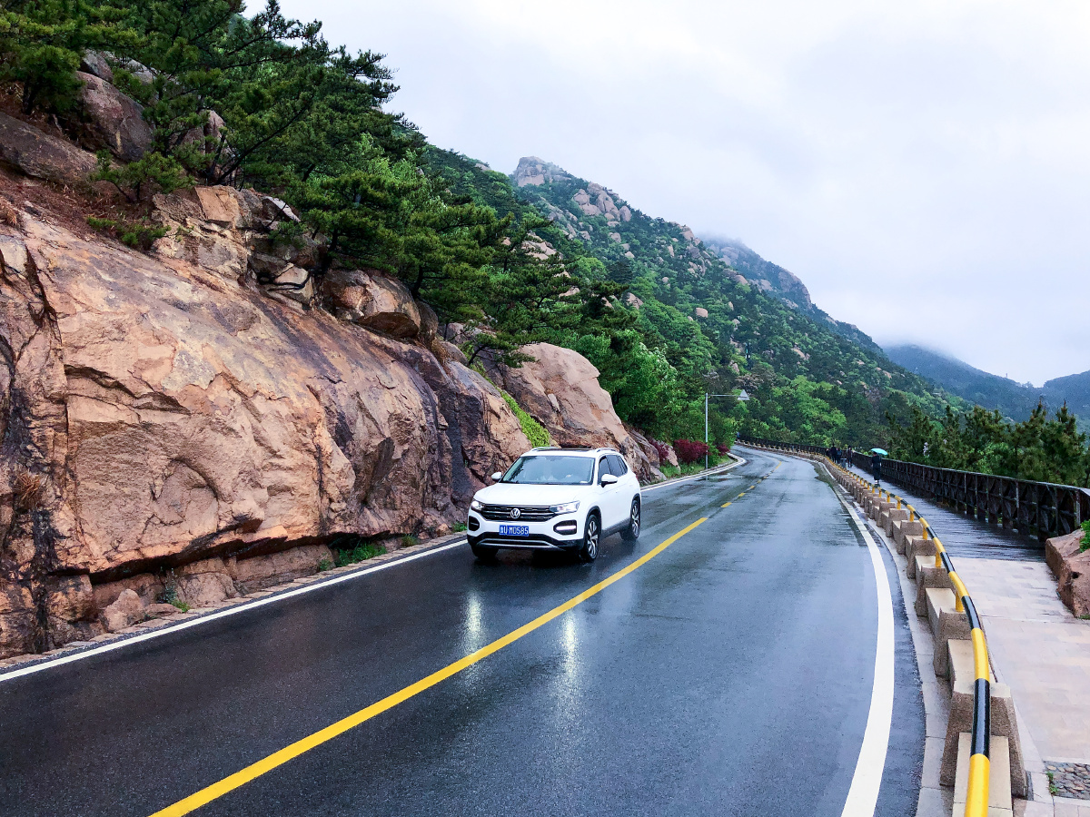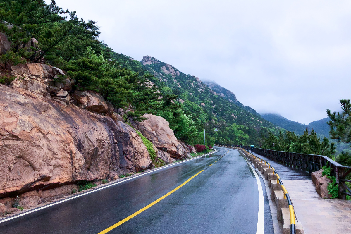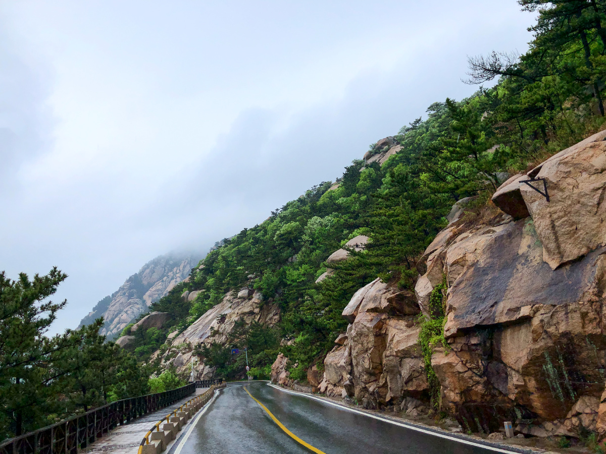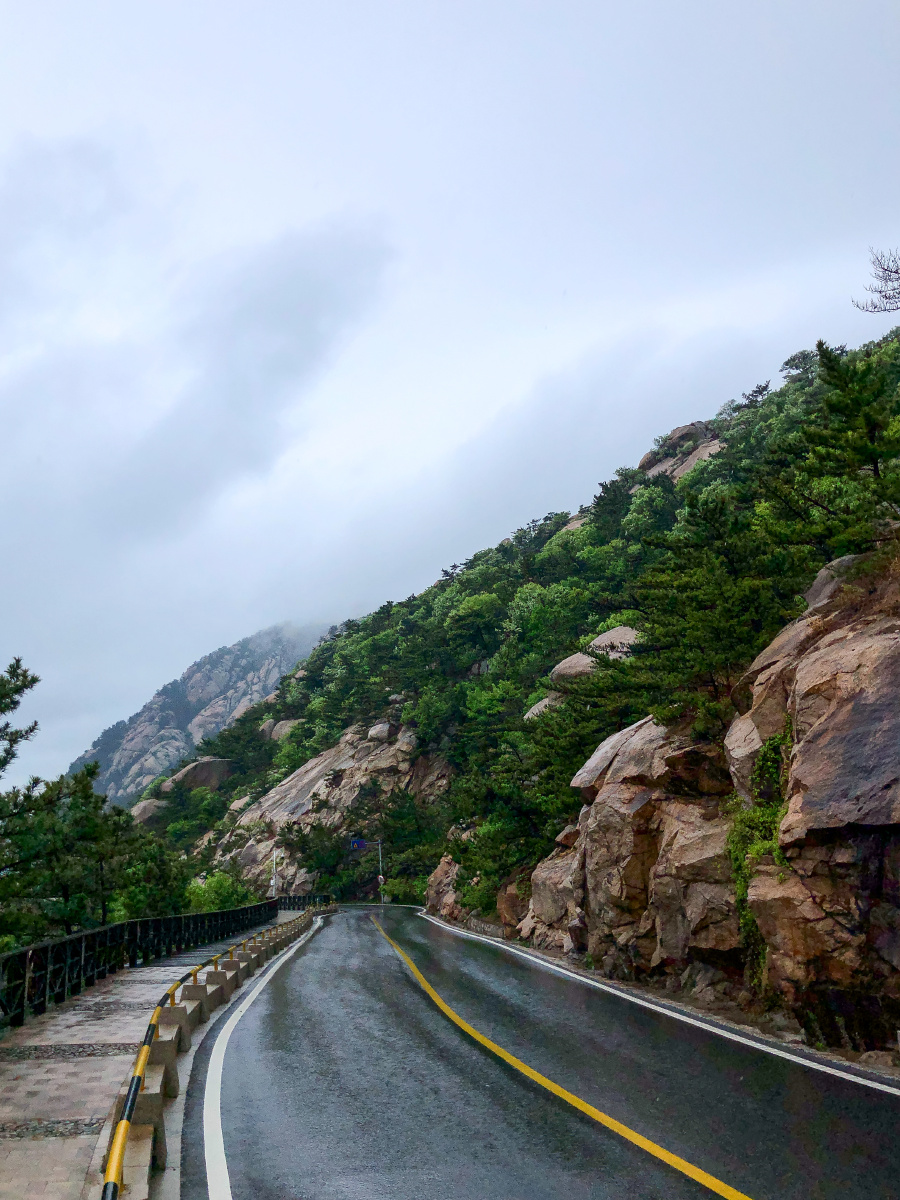 雨天,青岛崂山风景区前往太清宫方向的沿海公路。五一假期。